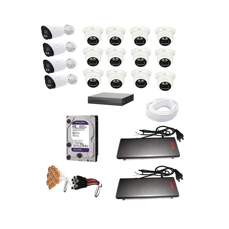 • CP Plus All In One 16 Channel H.265+ New Latest DVR- 1 Nos Come with CP Plus Guard+ 2.4MP Color Night vision Outdoor Bullet Camera- 4 Nos,CP Plus Guard+ 2.4MP Color Night vision Indoor Dome Camera- 12 Nos , 4TB Surveillance Hard Drive with 3 years manufacturer warranty- 1 No, 12V 10Amp 8 Ch SMPS- 2 No , 3+1 Copper Cable Bundle- 1 No, BNC Connectors- 32Nos, DC Connectors- 16 Nos.
